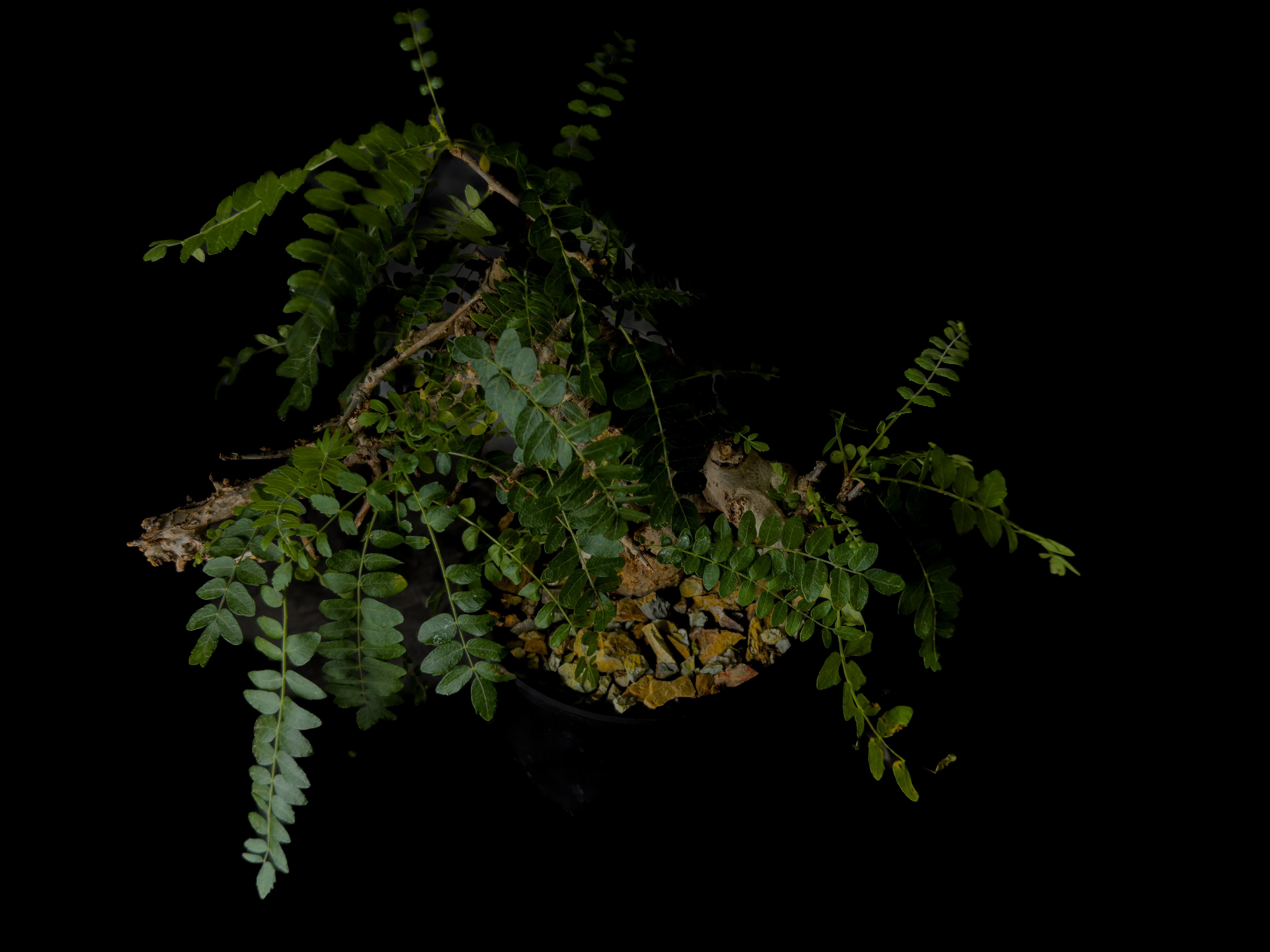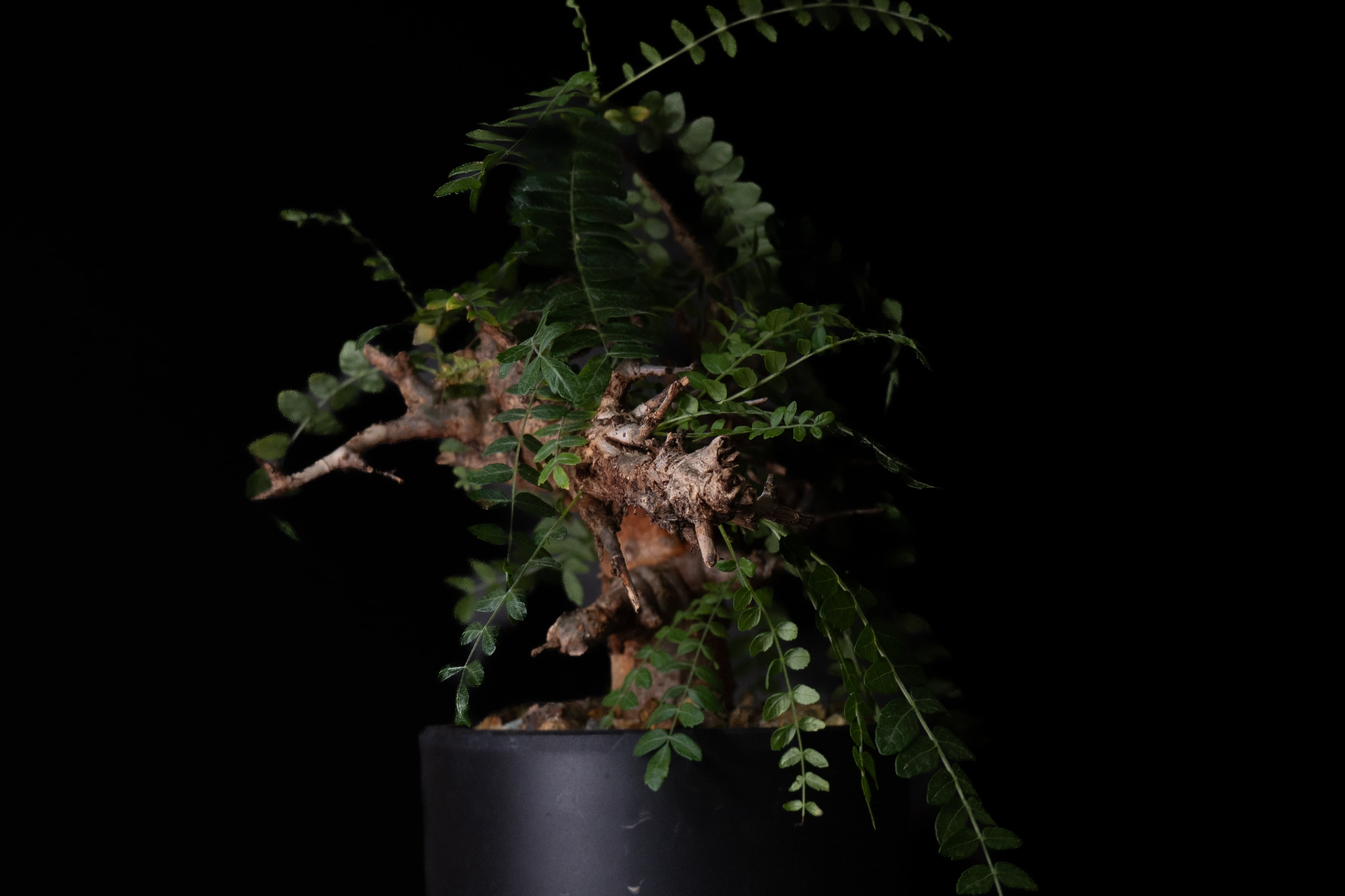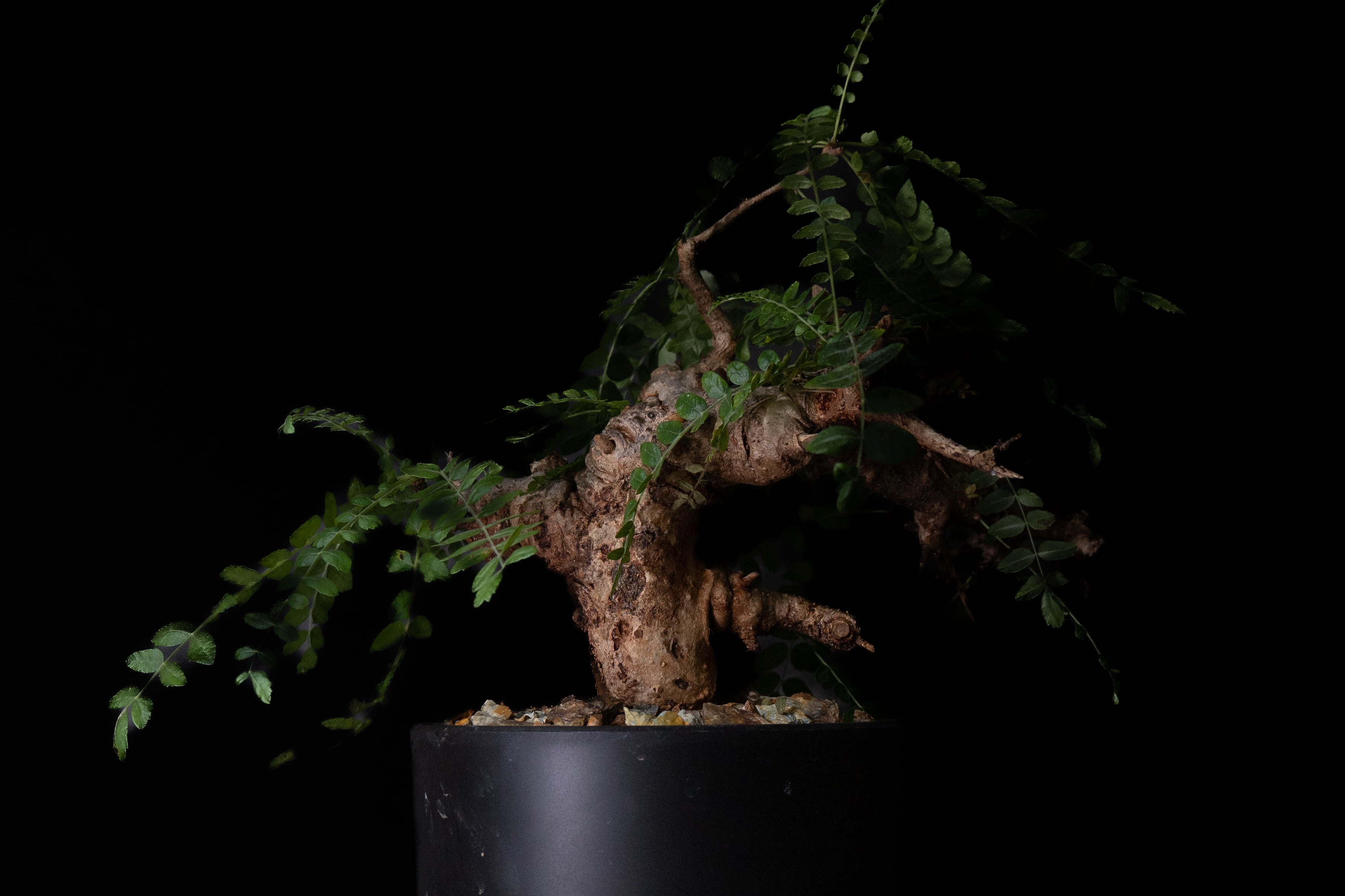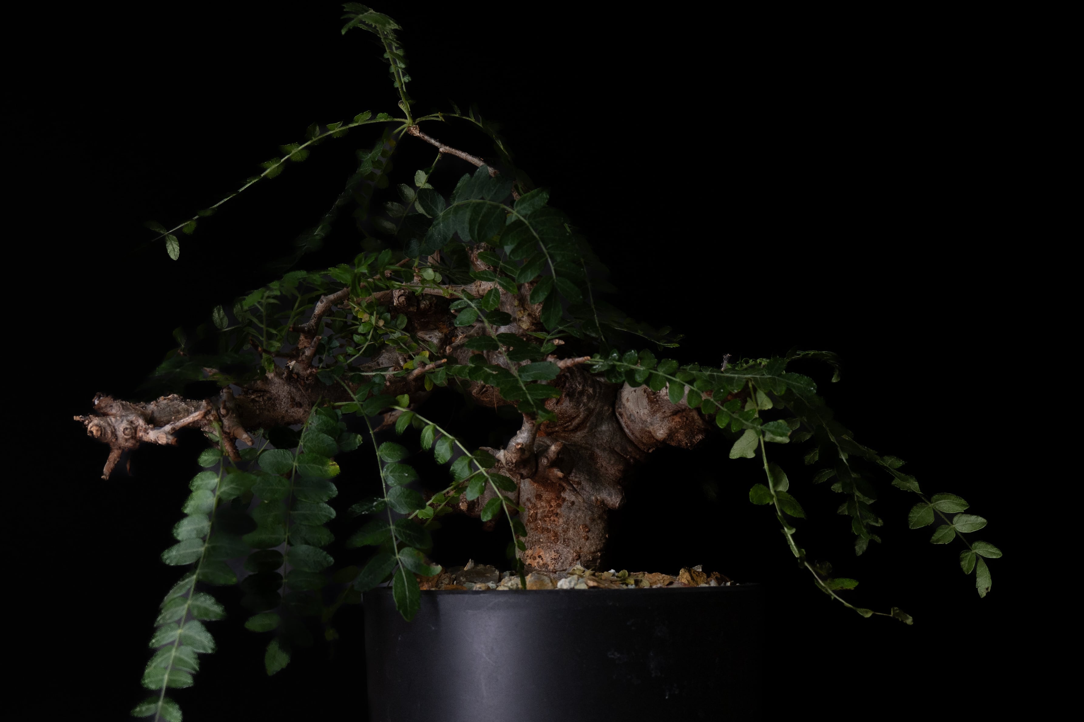 本株は、塊状に膨らんだ基部と、乾燥地帯特有の荒い樹皮質が見られる個体です。枝は横方向へ張りやすく、細かい小葉を多数つけるため、葉量が増えると柔らかい印象になります。一方で、季節に応じて落葉することもあり、変化を楽しめる種類です。