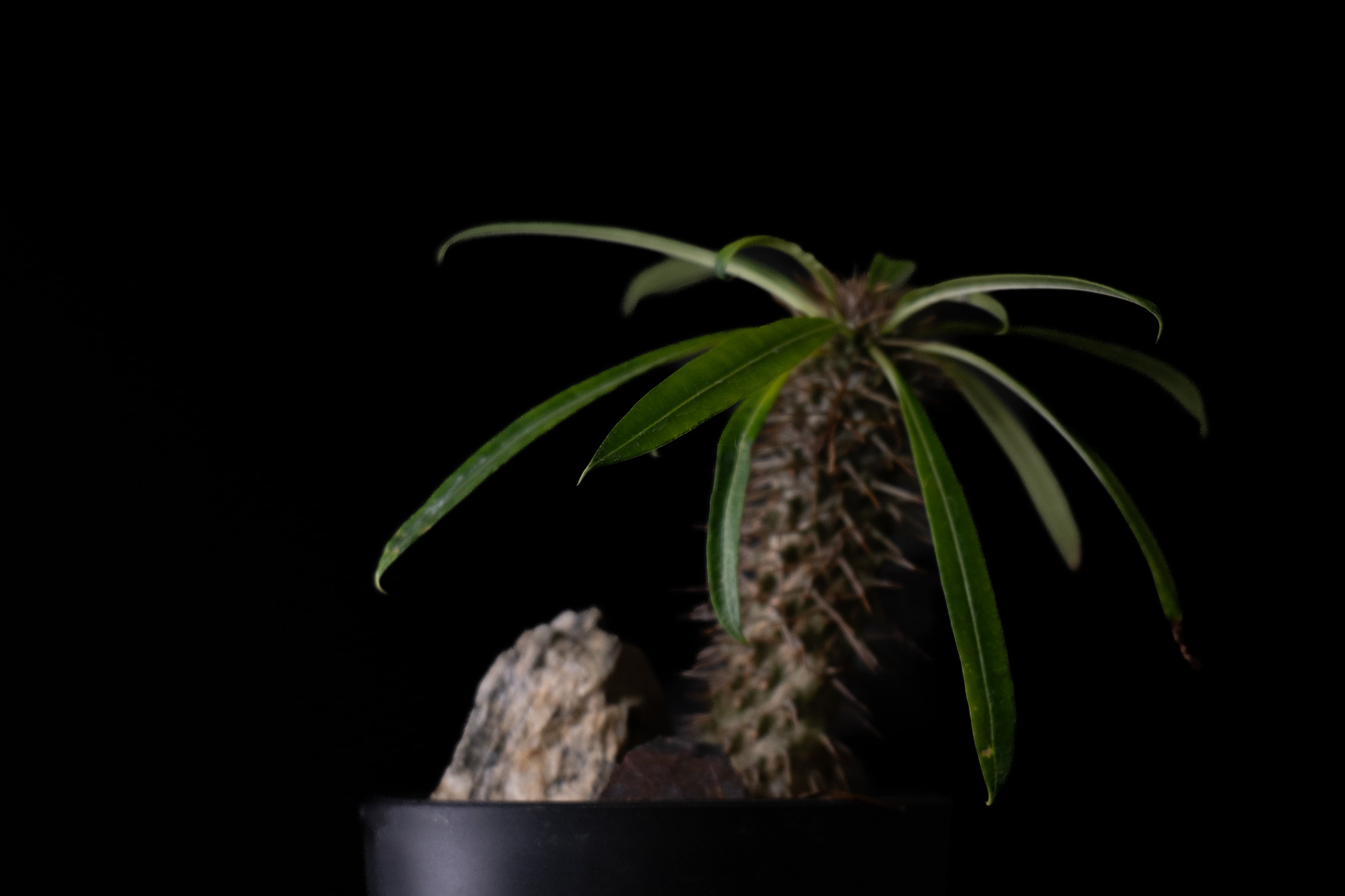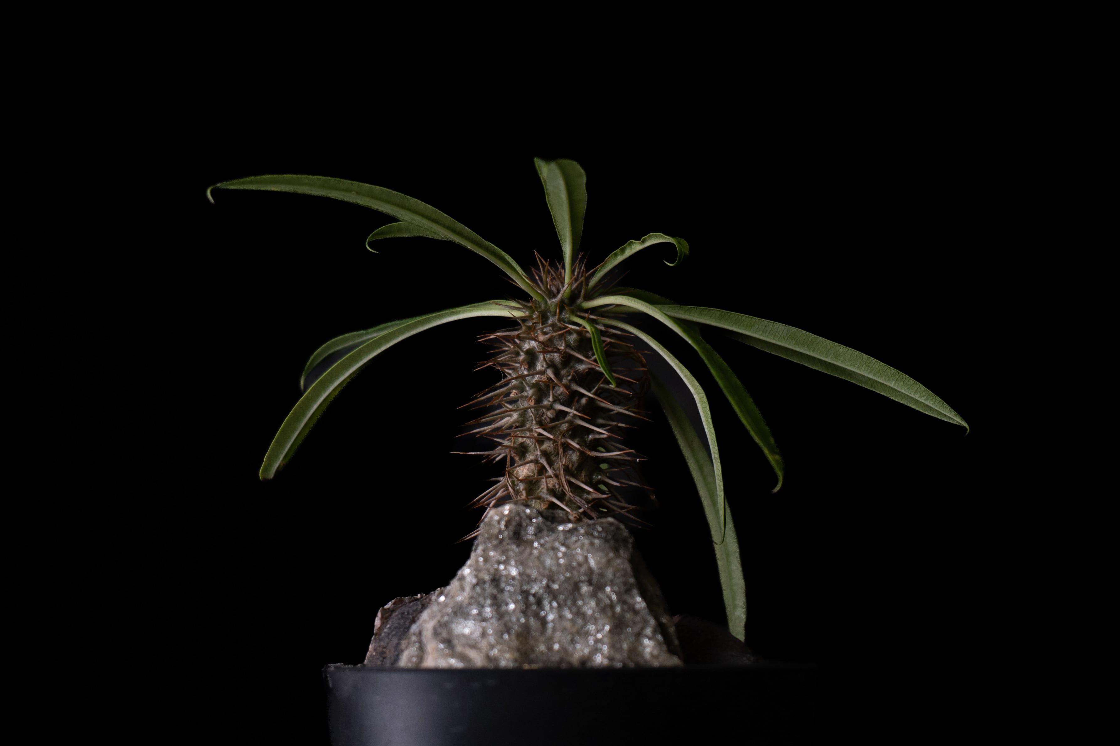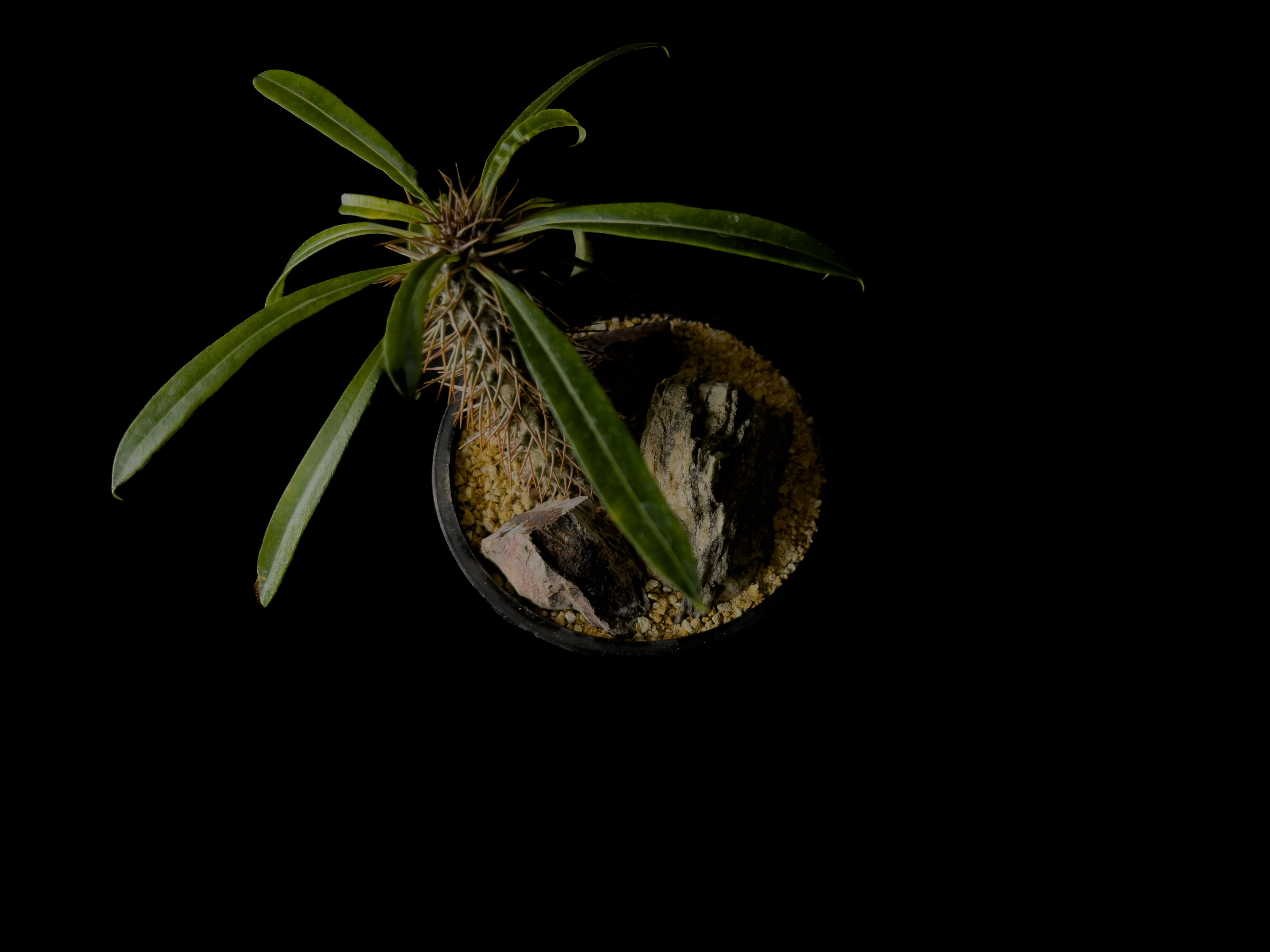 今回の株は、マダガスカル南部の標高の低い乾燥砂地に根を下ろしている様子を想像しながら植え付けを行いました。遮るものの少ない平野で、風に削られた岩の間から幹を立ち上げるイメージをもとに、砂質の質感と荒れ地の雰囲気を控えめに取り入れています。RePlantsのハビタットスタイルはあくまで店主の妄想に基づく架空の情景であり、現地の状況を再現したものではありません。