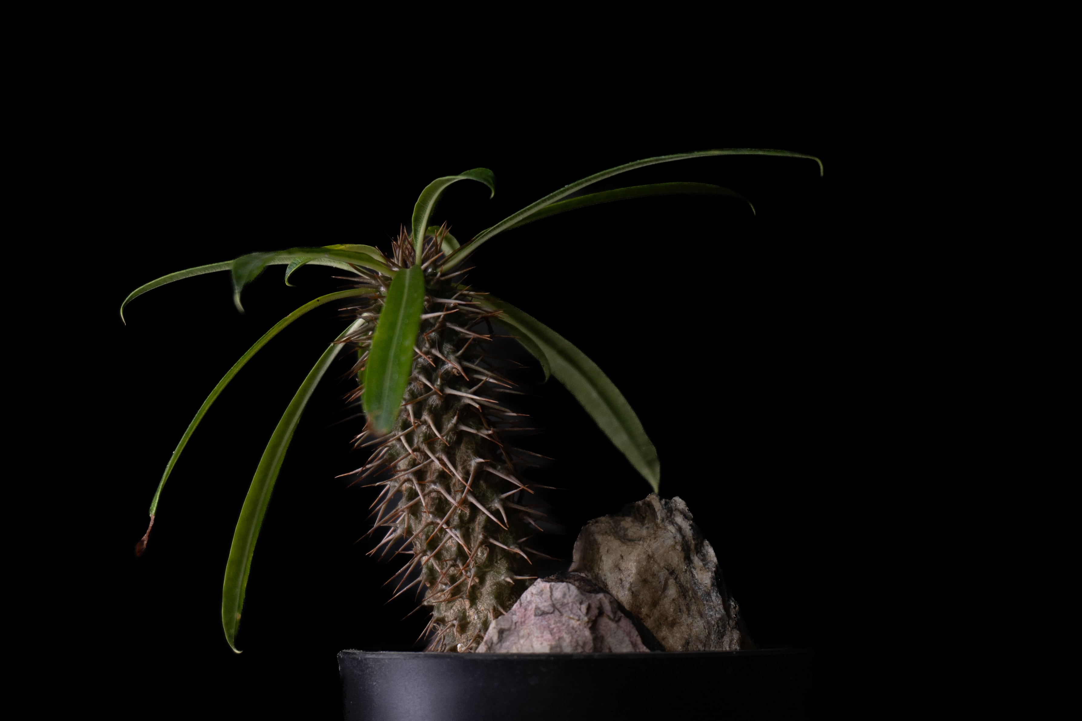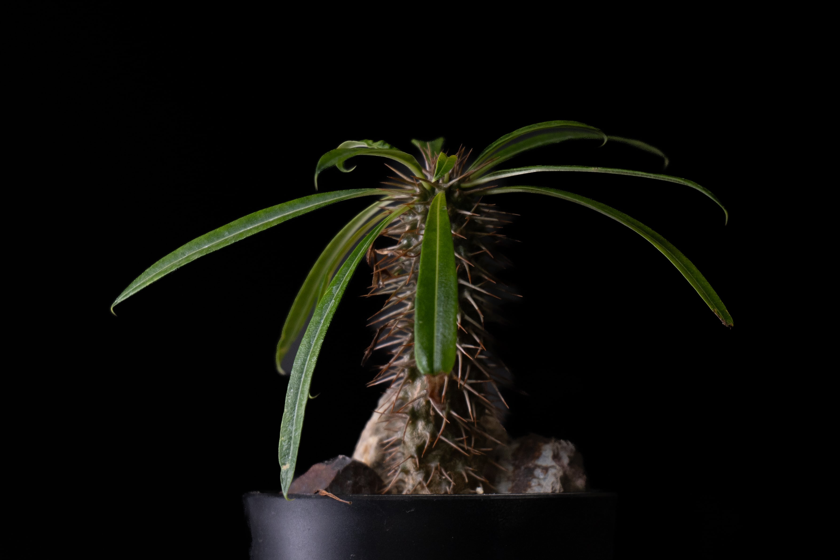 パキポディウム・ラメリーは、マダガスカル南部の乾燥地帯に広く分布する夏型の塊根植物です。強い日射と降雨量の少ない環境に適応し、乾燥した砂礫地でも生育できる丈夫さを備えています。太く硬質な幹には鋭い棘が並び、頂部から細長い葉を広げる独特の姿が特徴です。