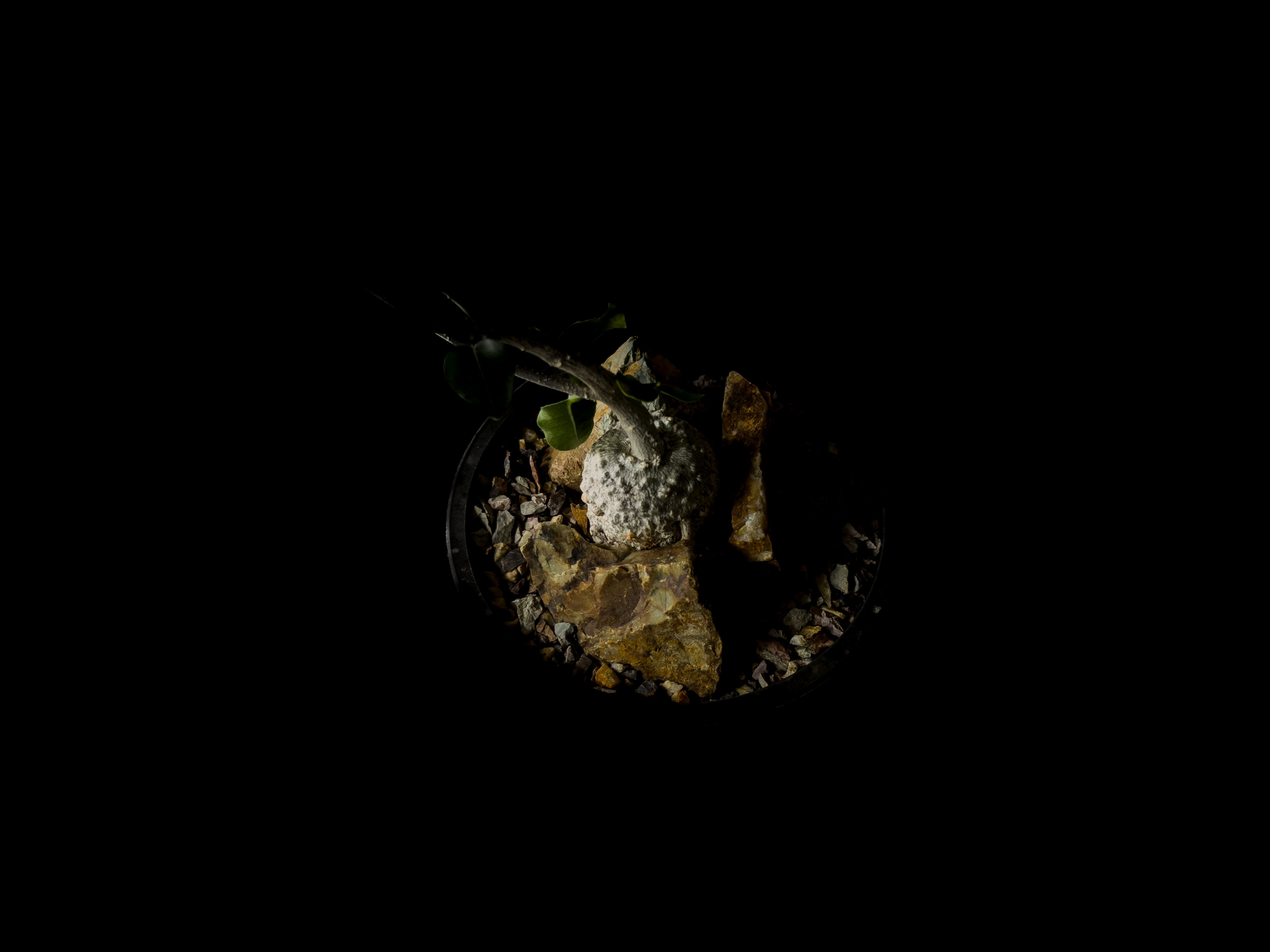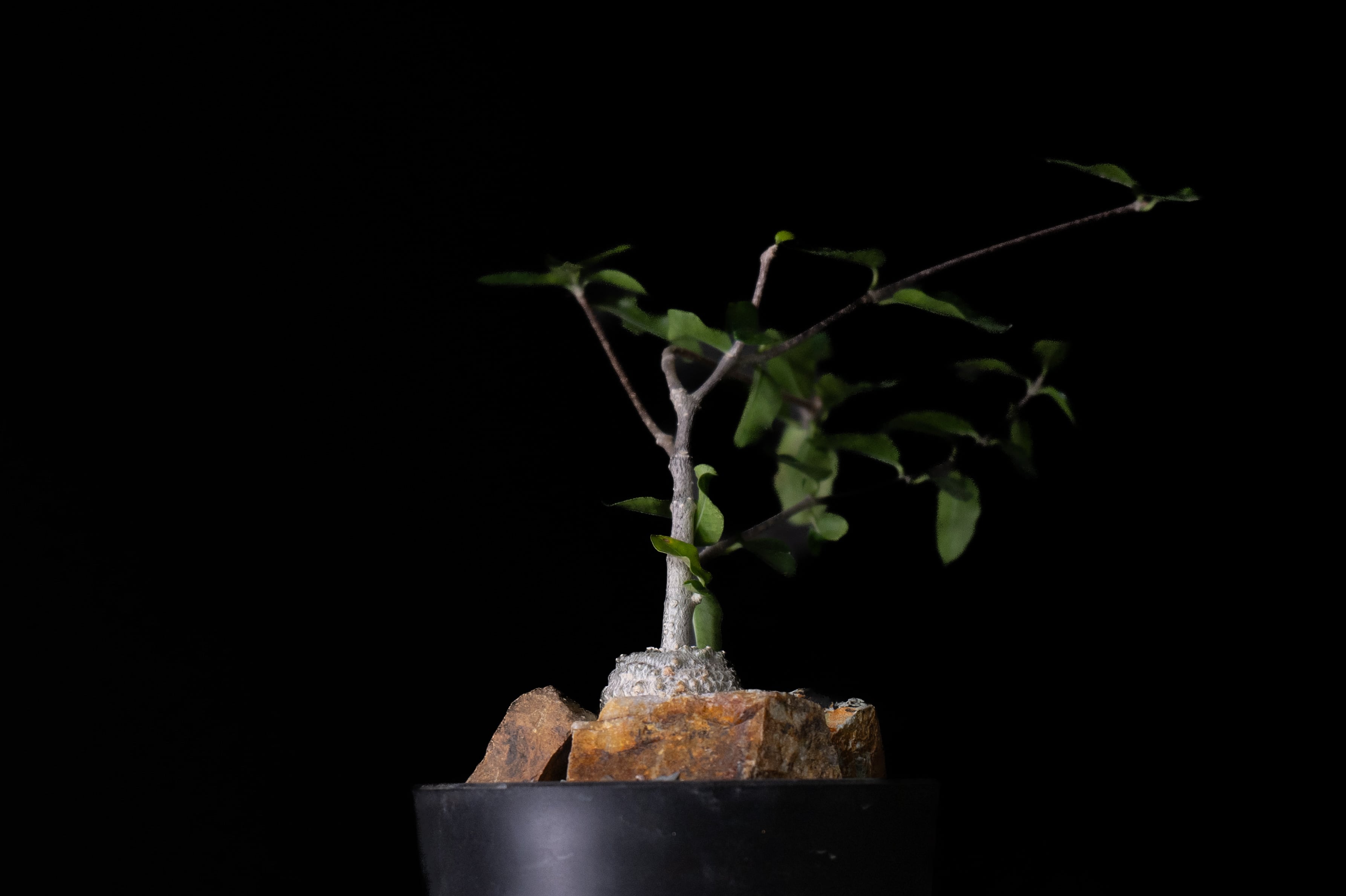 今回の株は、岩の割れ目に根を下ろし、乾いた斜面に沿って枝を伸ばしていく姿をイメージしながら植え付けています。南部アフリカの丘陵地で、風を受けながらたくましく生育する姿を思い浮かべ、その一瞬を切り取ったようなハビタットスタイルとして構成しました。