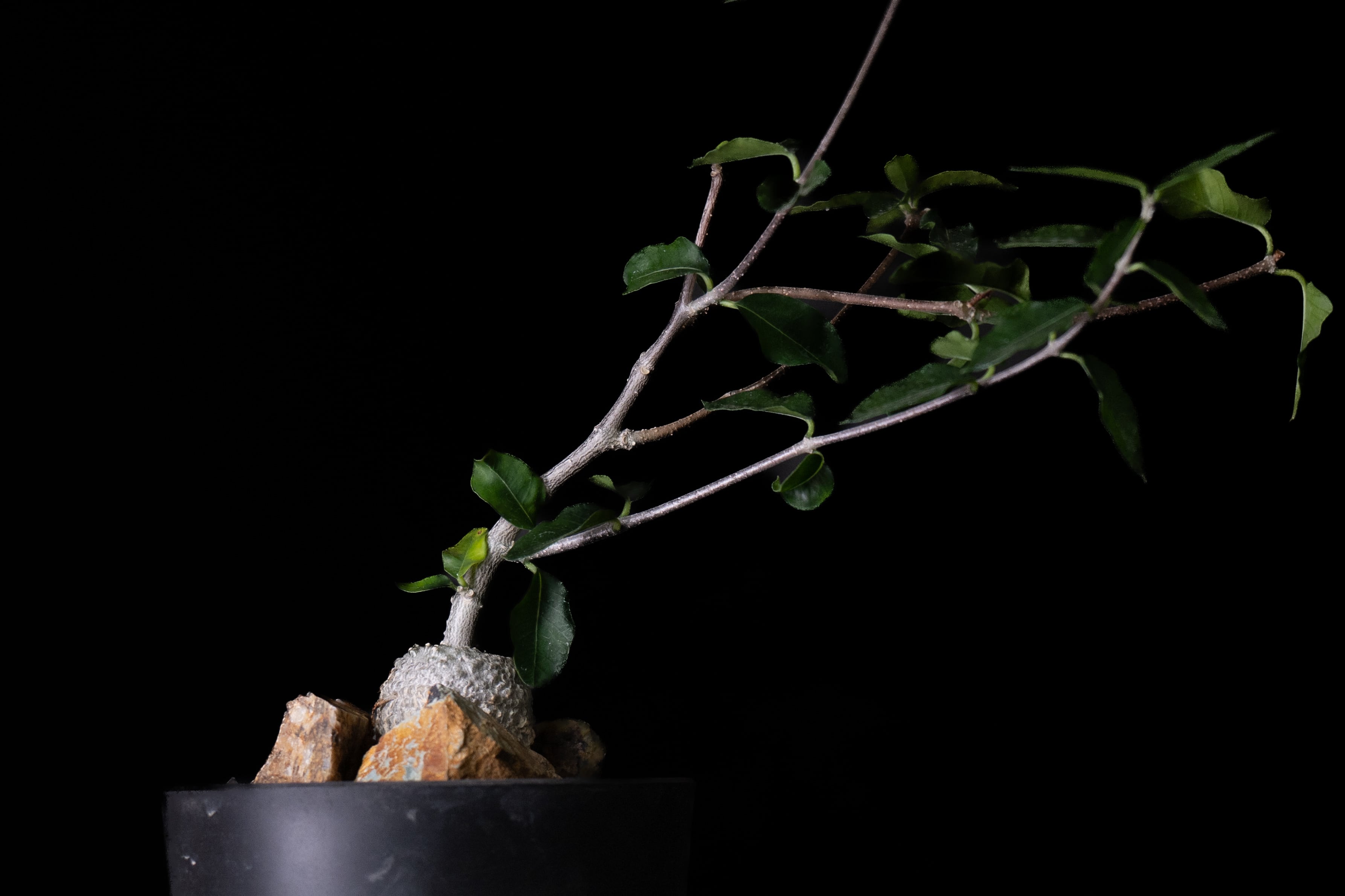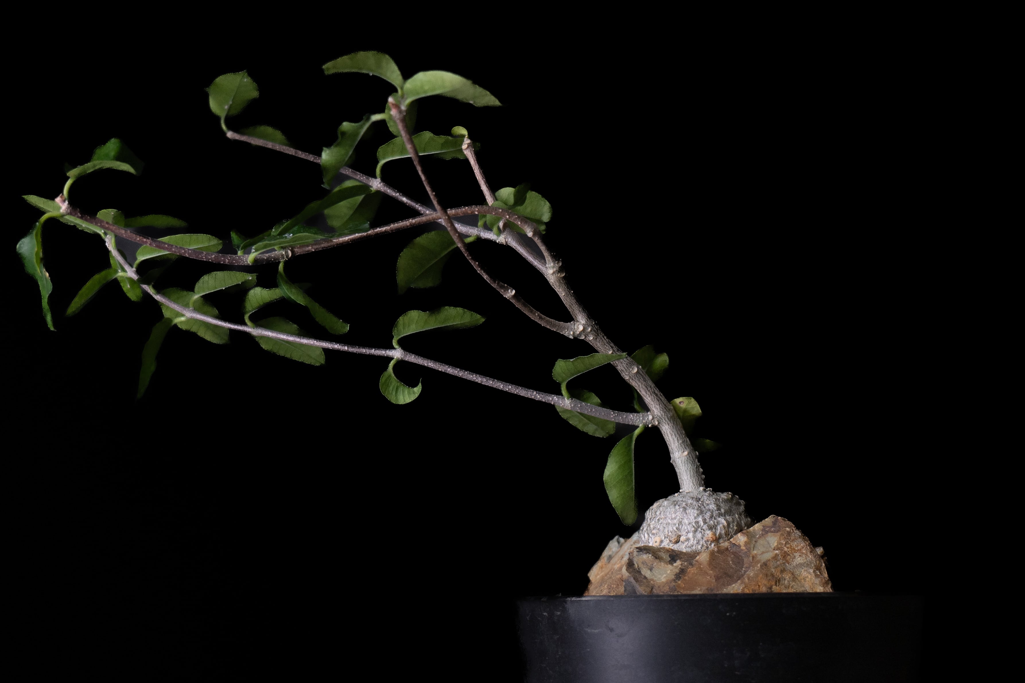 本種は、南アフリカ北ケープ州から西ケープ州、さらにナミビア南部にかけて分布する植物で、乾燥した草原や岩場が連なる丘陵地に自生します。過酷な環境下で生き抜くため、地中には水分を蓄える肥大した塊根を形成し、そこから細くしなやかな枝を伸ばします。枝先に見られる光沢のある葉と、薄緑色の控えめな花は、本種ならではの特徴です。