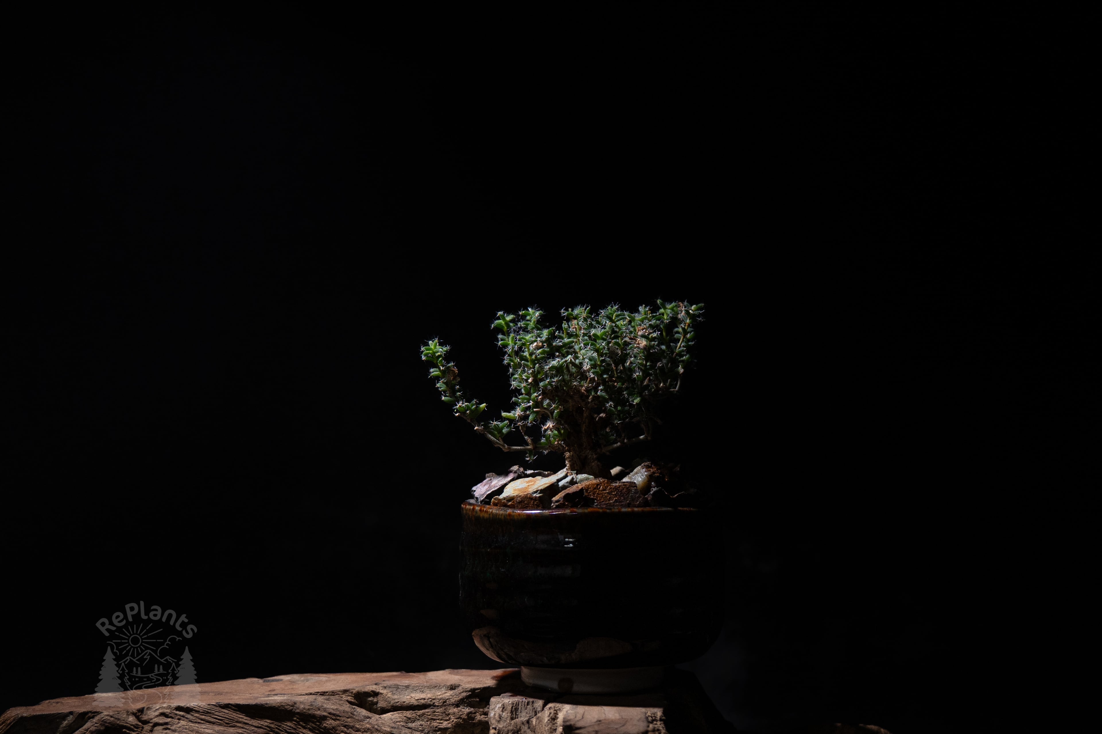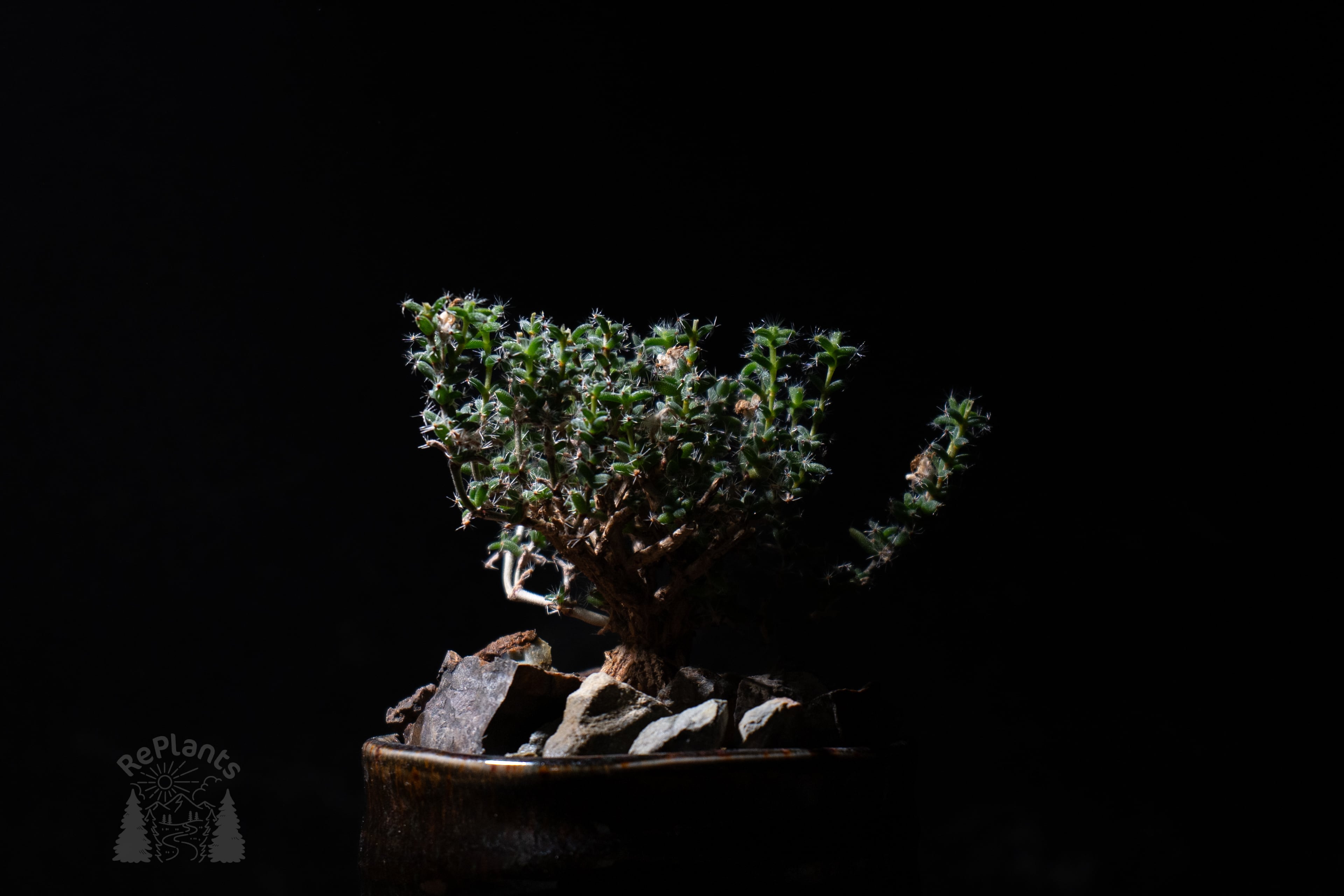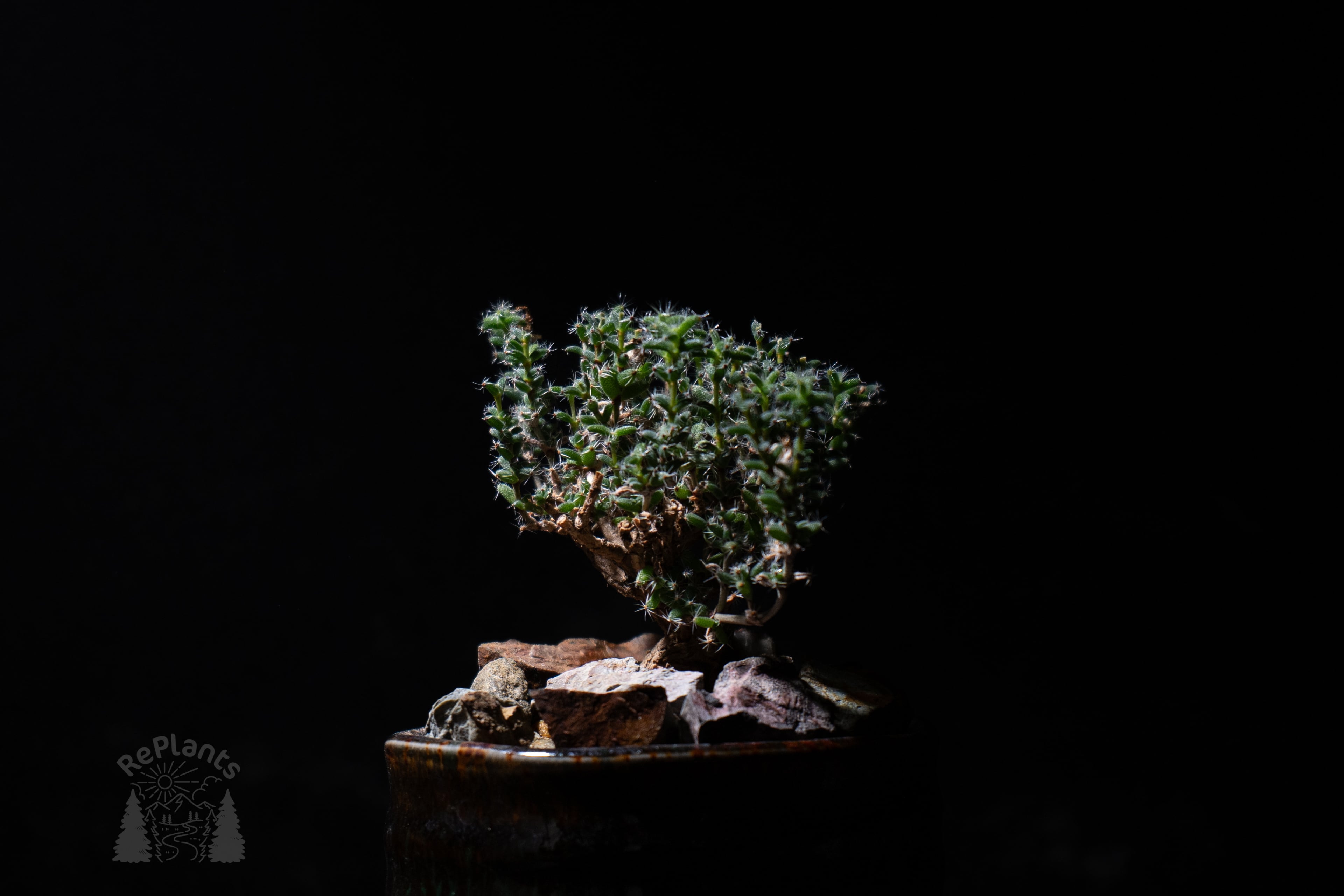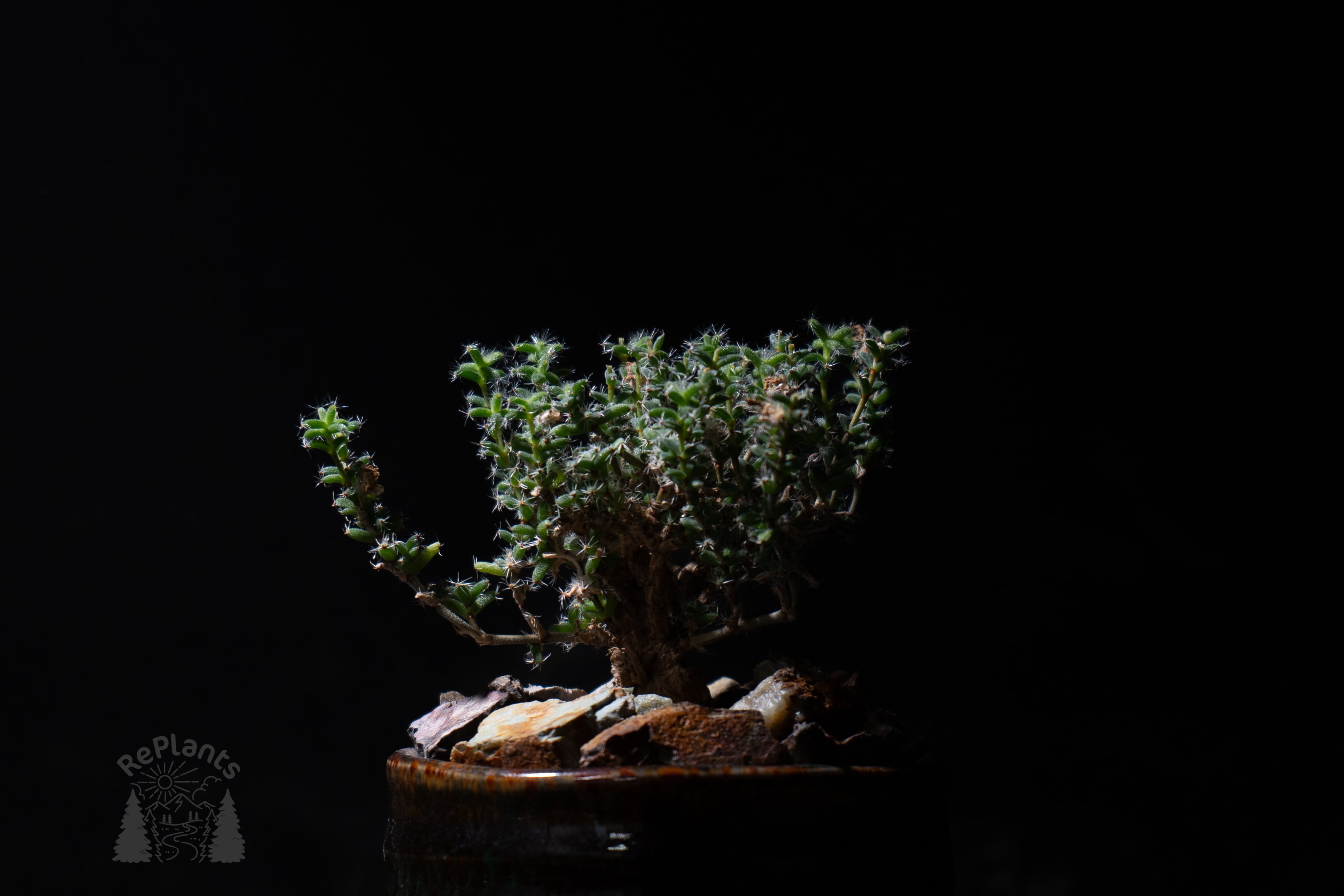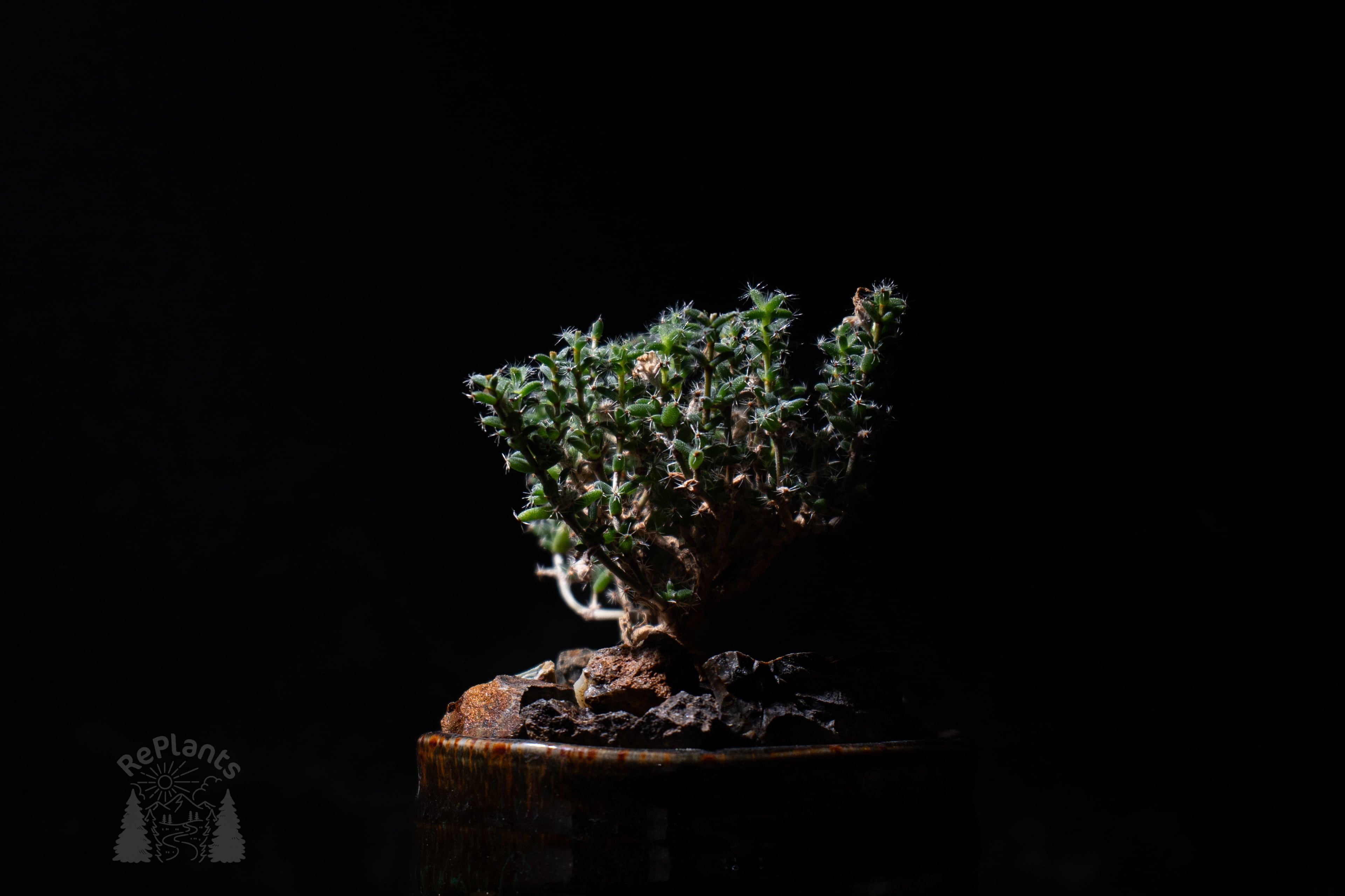 トリコディアデマ・ブルボスムは、根元にふくらみを持つ独特な塊根と、細かい多肉質の葉が特徴です。塊根部分は成長とともに太くなり、まるで小さな盆栽のような趣を楽しむことができます。葉には細かな白い毛が生えており、光を受けるとふんわりとした柔らかい印象を与えます。
